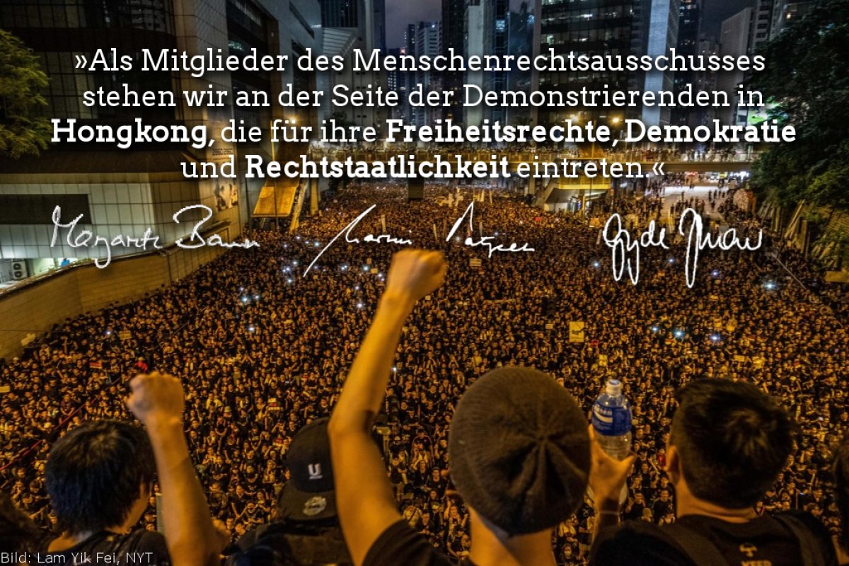 We appeal to the Hong Kong Government not only to suspend the controversial legislative changes, but to formally withdraw it. As members of the Human Rights Committee of the German Bundestag, we stand shoulder to shoulder with the demonstrators in Hong Kong who share our values of civil liberty, democracy and the rule of law. Charges of rioting against demonstrators under the draconian Public Order Ordinance, which are signs of a progressive restriction of the customary civil liberties, are unacceptable and must be dropped immediately. We also condemn the use of rubber bullets and tear gas and the excessive use of force by the police against demonstrators and journalists. A comprehensive public inquiry into police violence must be carried out by an independent body.