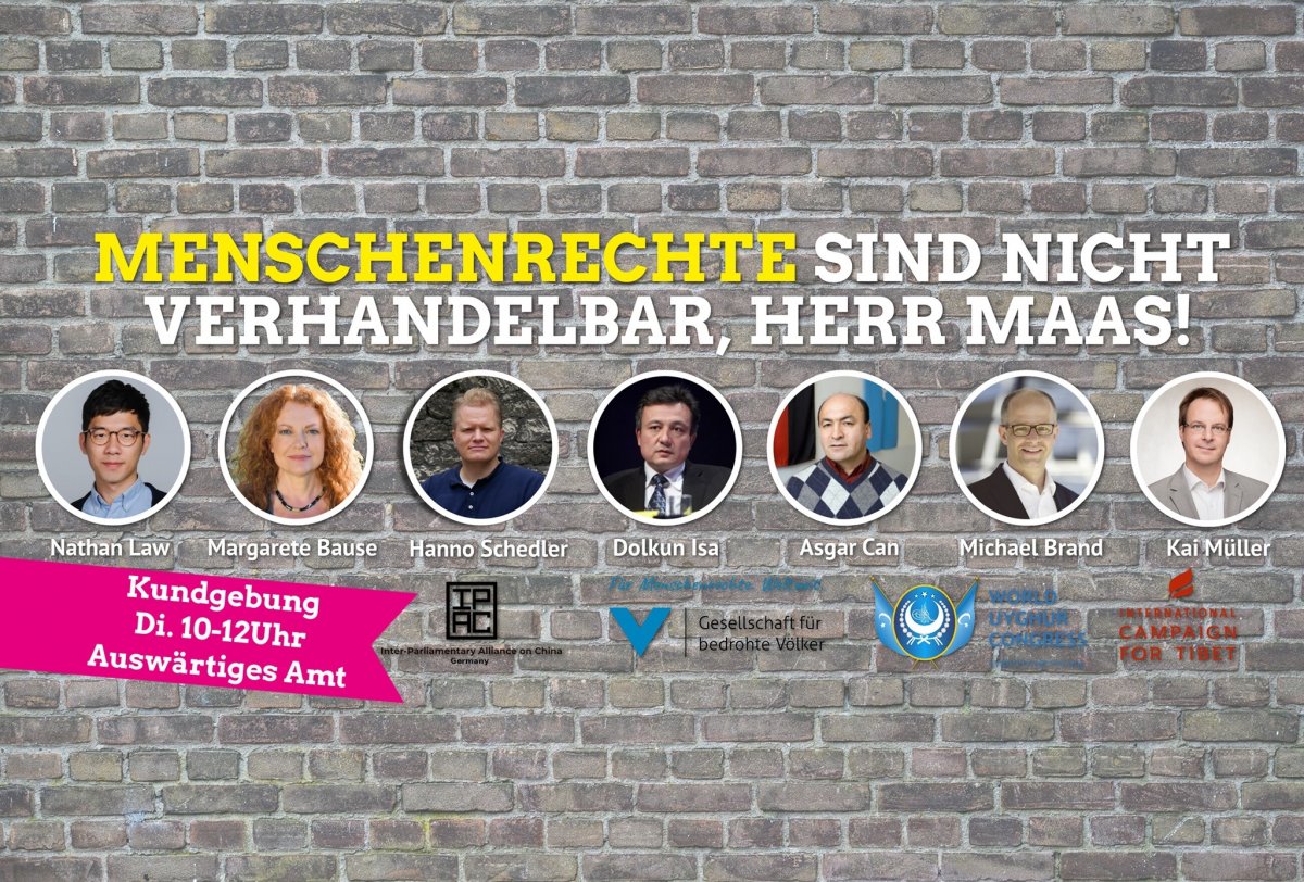 Anlässlich des Besuchs des chinesischen Außenministers Wang Yi bei seinem deutschen Amtskollegen Heiko Maas laden die Inter-Parliamentary Alliance on China (IPAC-Germany), der Weltkongress der Uiguren (WUC) und die Gesellschaft für bedrohte Völker (GfbV) zu einer Kundgebung vor dem Auswärtigen Amt ein.