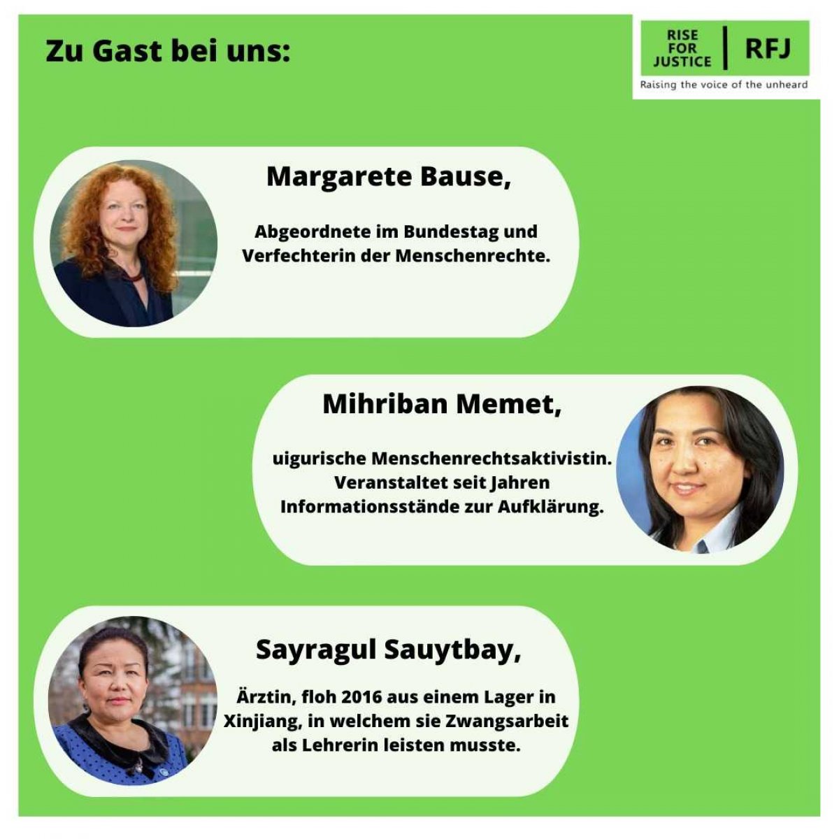 Gemeinsam mit Mihriban Memet, einer uigurische Aktivistin, und Frau Sayragul Sauytbay, einer kasachischen Ärztin, werde ich auf der Veranstaltung von "Rise for Justice" über die Menschenrechtslage in Xinjiang reden.
