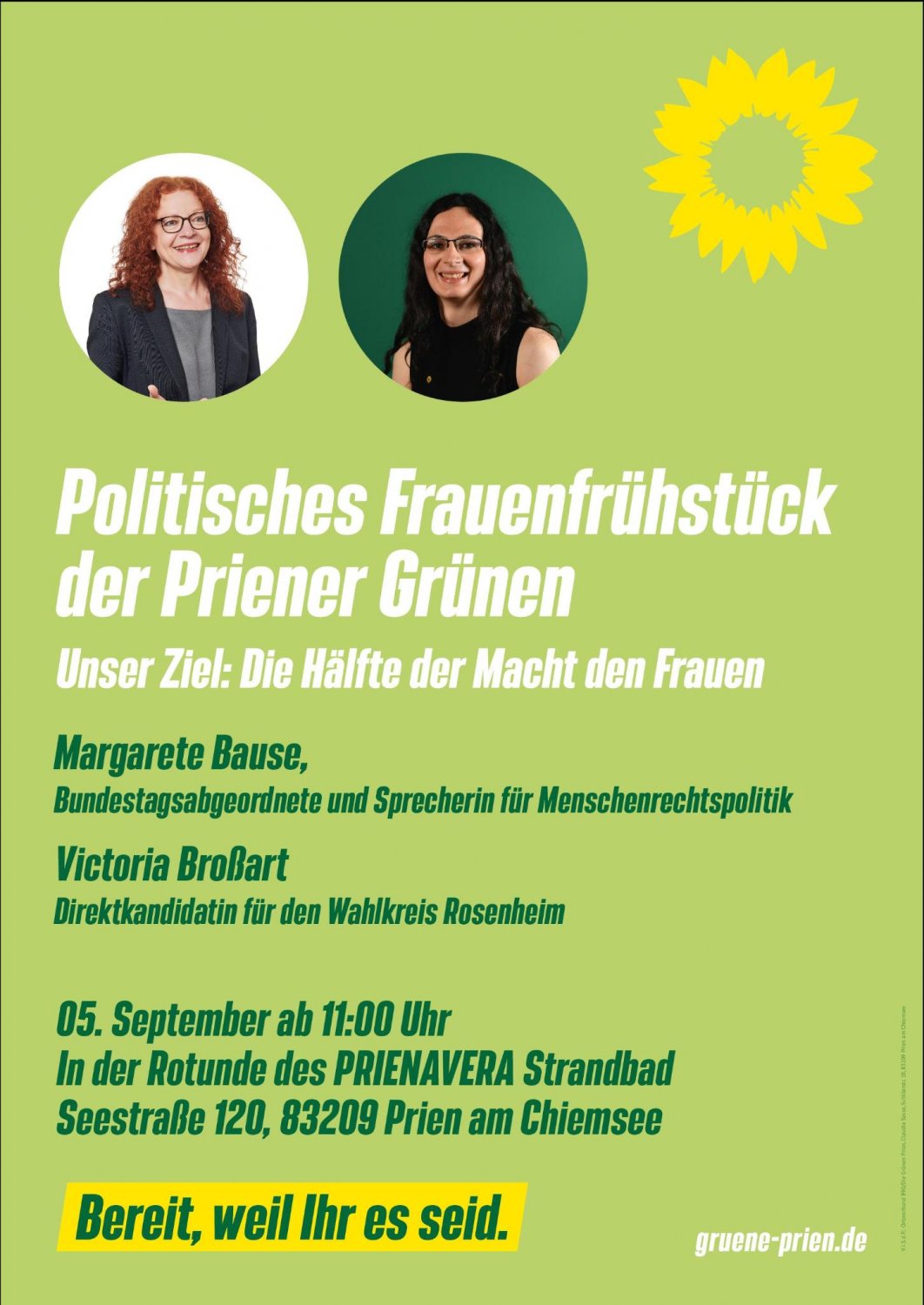 Auf Einladung der Grünen in Prien wird Margarete Bause gemeinsam mit Victoria Broßart, der grünen Direktkandidatin des Wahlkreises Rosenheim, an einem frauenpolitischen Frühstück teilnehmen.