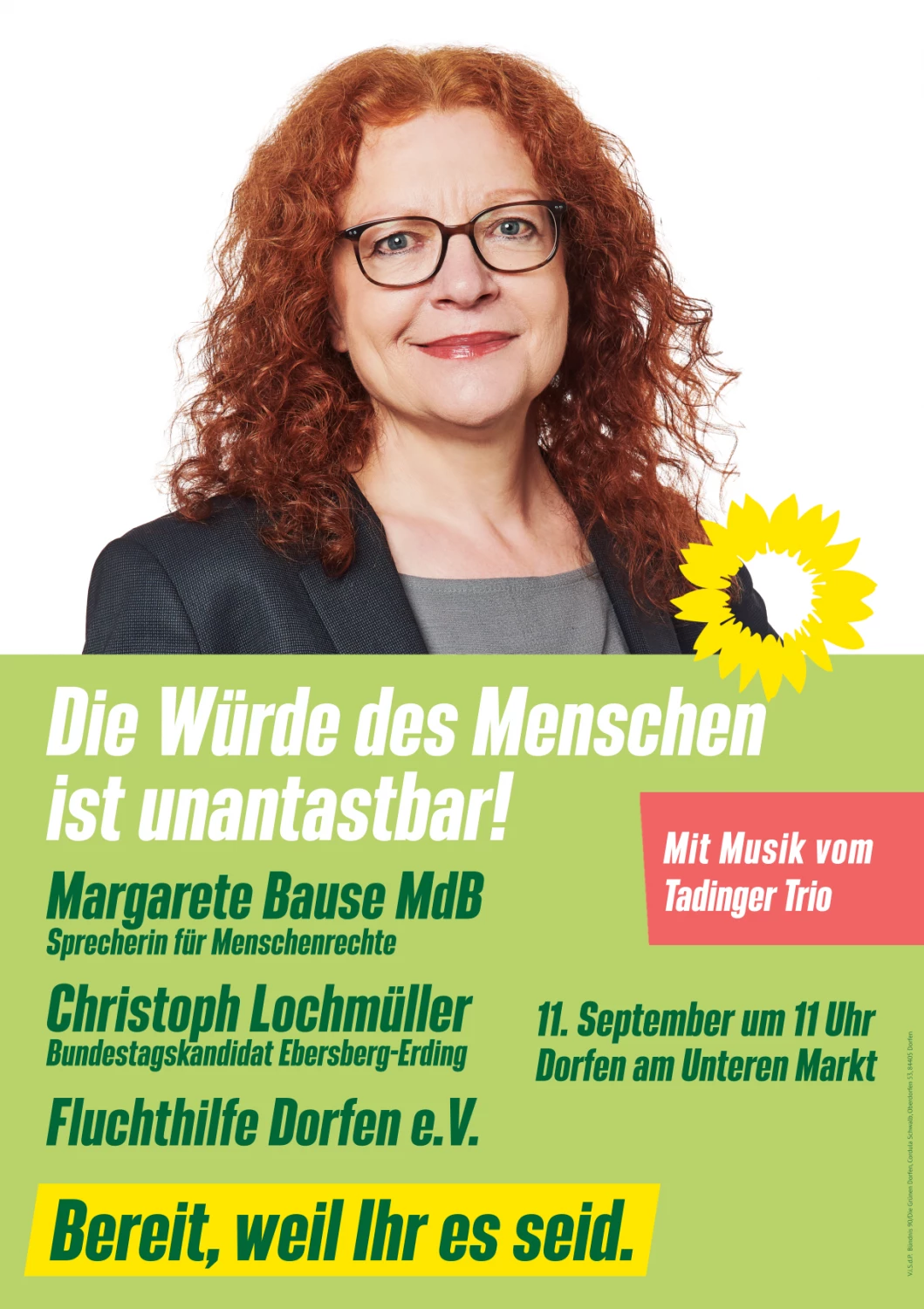 Auf Einladung des lokalen Ortverbands ist Margarete Bause am 11. September in Dorfen am Unteren Markt, um mit Christian Arz, dem Direktkandidaten des Wahlkreises Erding-Ebersberg über Menschen- und Bürgerrechte in der Demokratie zu reden.